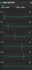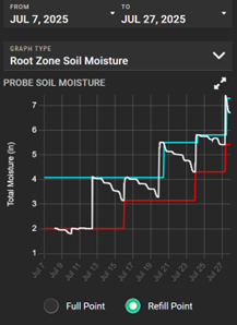 Once the soil moisture sensor is installed, we begin collecting data. The raw soil moisture sensor readings can be challenging to interpret, as the sensor measures nearby soil moisture by volume, which doesn’t directly align with irrigation scheduling needs. Instead, we convert these readings to depletion relative to field capacity. On FieldNET, users can convert raw volumetric water content (VWC, in %) to inches of soil moisture depleted by selecting readings on the soil moisture graph following a significant rainfall event. They can also identify the depth of the current root zone by reviewing the Root Depths graph and selecting the point where they first observe a daily repeating pattern of soil moisture depletion.