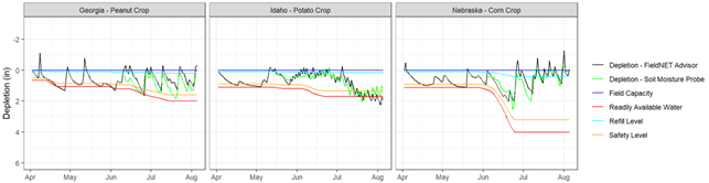 This graph shows the readings of soil moisture depletion from the soil moisture sensor (green line) and the predictions of soil moisture depletion from FieldNET Advisor (black line). The additional lines indicate field capacity, refill level (less than field capacity to leave room for unexpected rainfall), safety buffer (when to turn the pivot on), and readily available water (where stress begins).