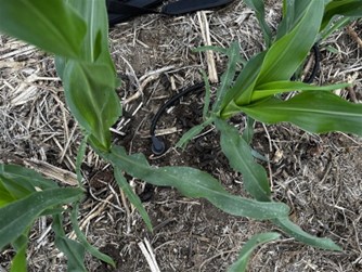 Close up of soil moisture sensor installed in the row of a corn crop.